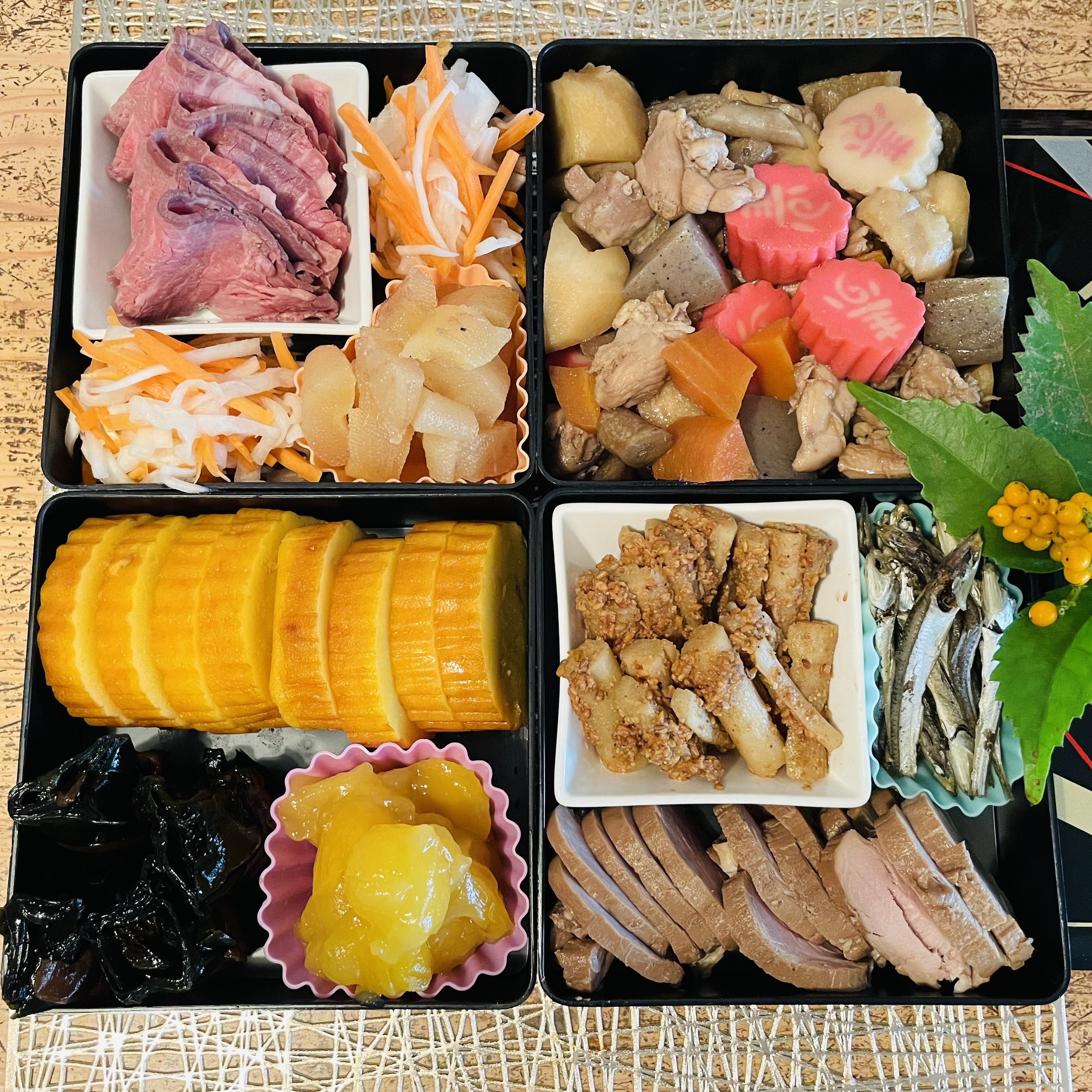 なます、たたきごぼう、田作り、焼豚、うま煮